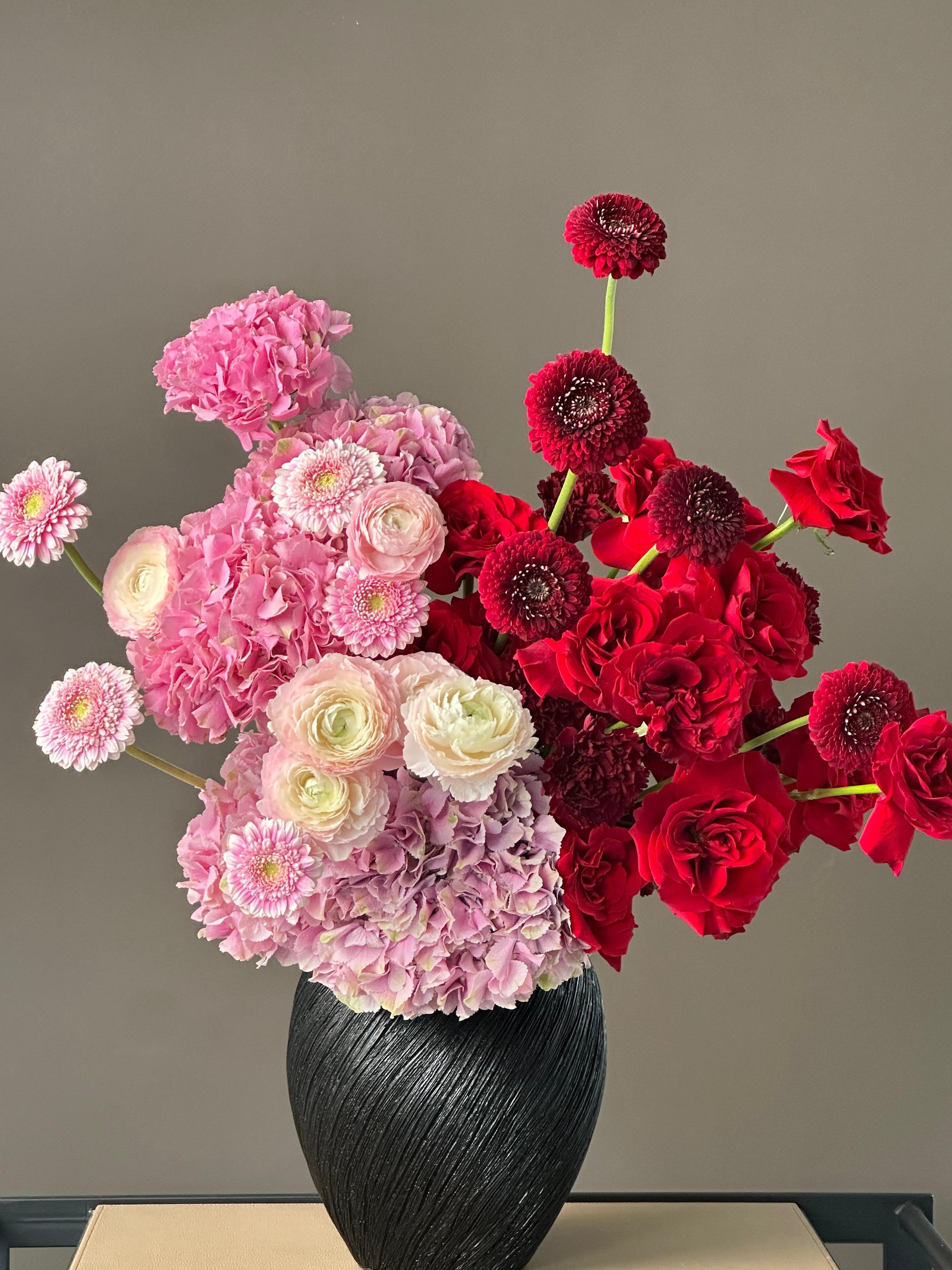 A signature luxury arrangement where rich crimson tones meet soft blush blooms.