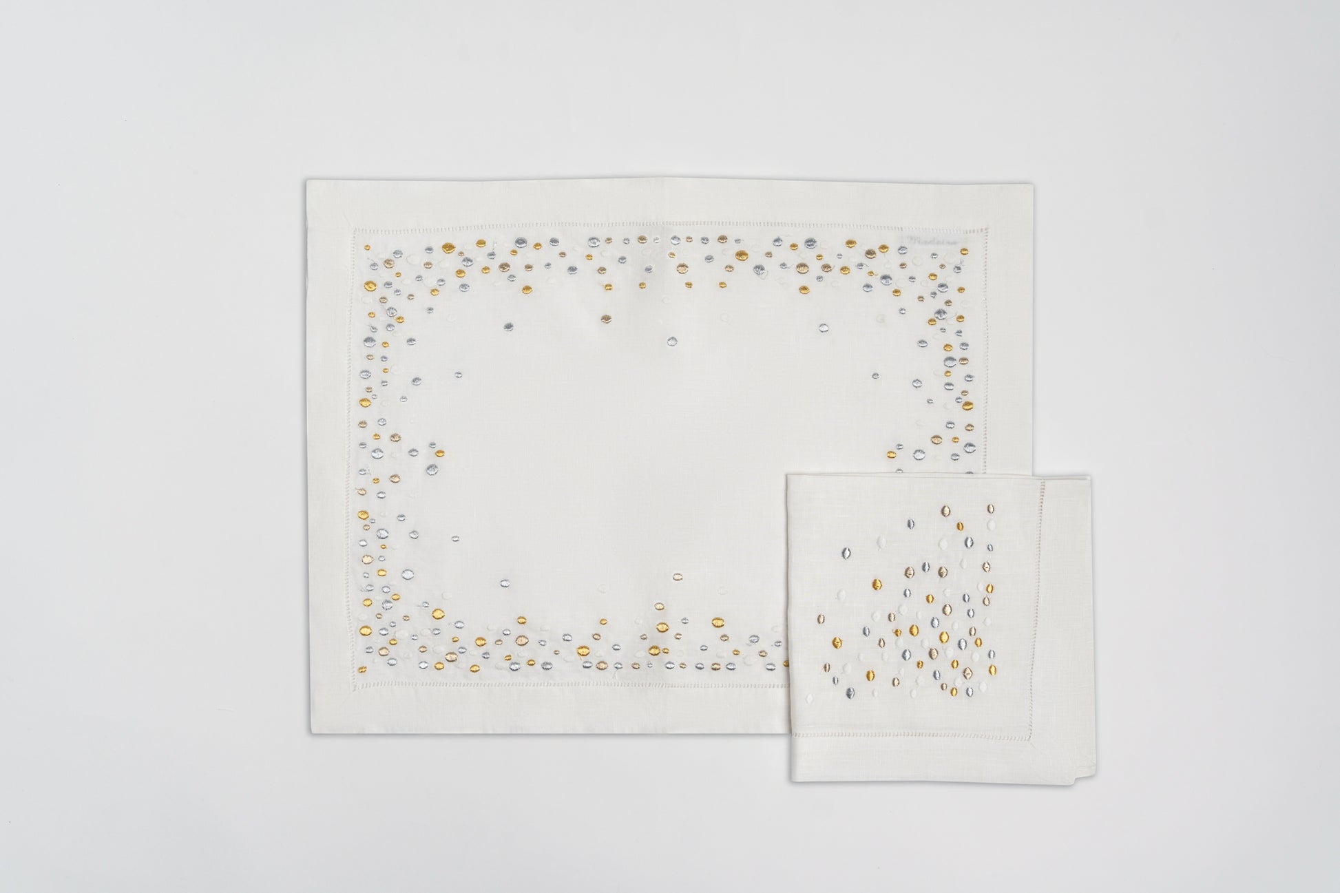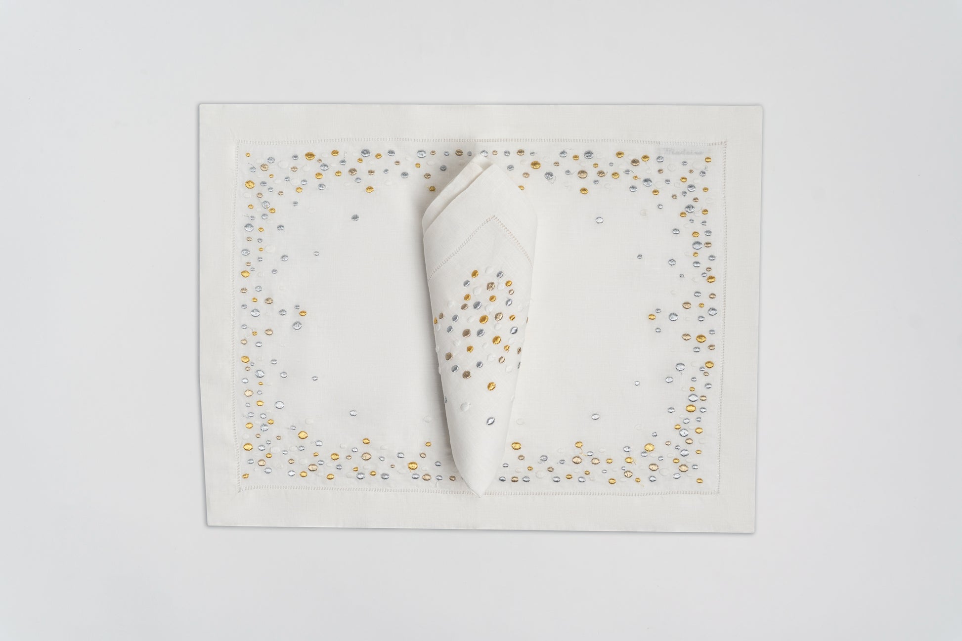 Introducing Polka Array, the perfect addition to your dining table. This elegant set includes embroidered placemats and napkins to elevate your dining experience. With its intricate design and quality craftsmanship, Polka Array will make a beautiful and functional addition to any setup.